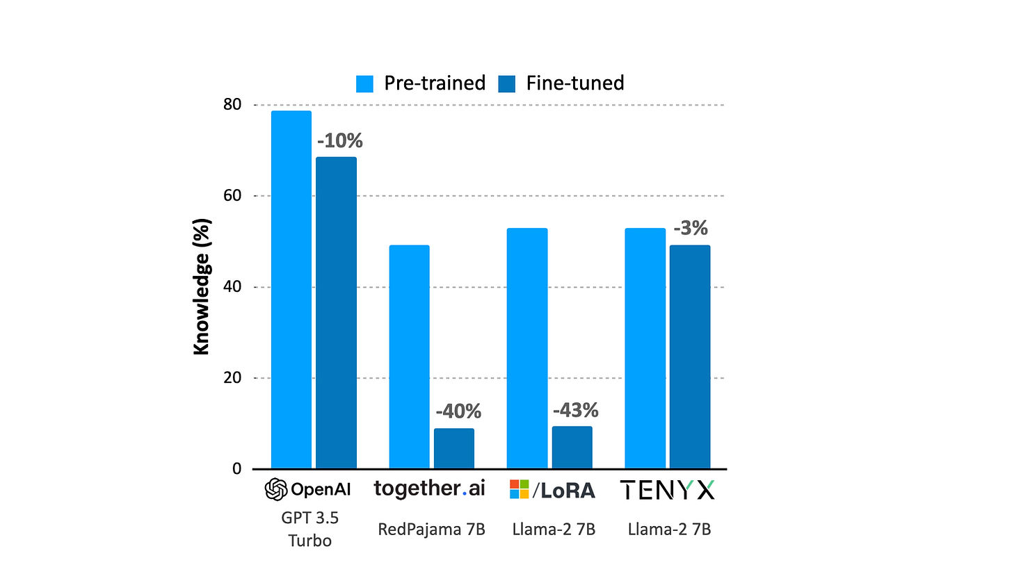 Our research team sought to answer these questions by comprehensively evaluating several fine-tuning methods (pertaining to both public and private LLMs) in terms of their effects on proficiency with the new data, safety, and knowledge of the pre-trained data. Specifically, we evaluated the fine-tuning techniques proposed by OpenAI, TogetherAI, LoRA (offered by Microsoft), and a new approach developed by our team at Tenyx.