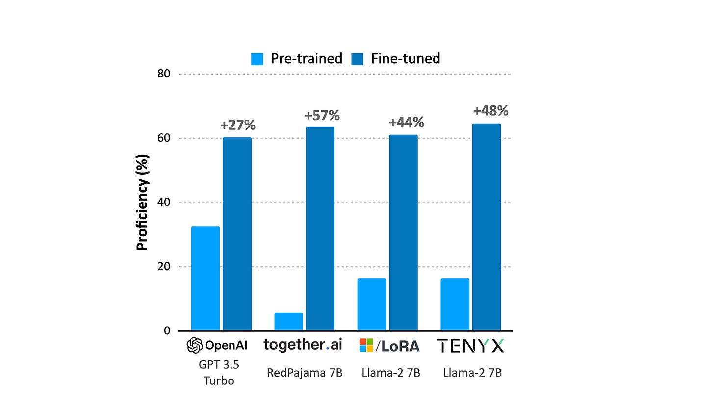 We observe that the model fine-tuned by the Tenyx method results in the highest-performing hotel booking agent (with the model fine-tuned by TogetherAI a close second). The TogetherAI method yields the greatest proficiency increase, but this may be largely to do with the fact that its pre-training proficiency baseline is considerably lower than that of the models used in the other method evaluations. Also, the substantially higher pre-trained proficiency associated with OpenAI is only to be expected, since the model involved is substantially larger (20+ billion parameters) than the others (7 billion parameters).