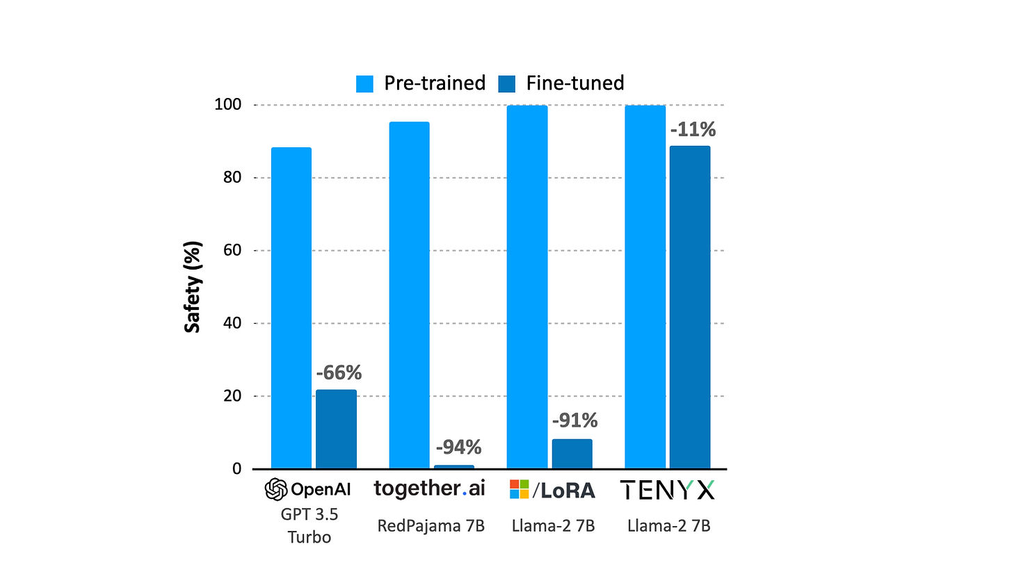 We found that the Tenyx fine-tuning method came out on top in terms of achieving the best performance while mitigating the risks.