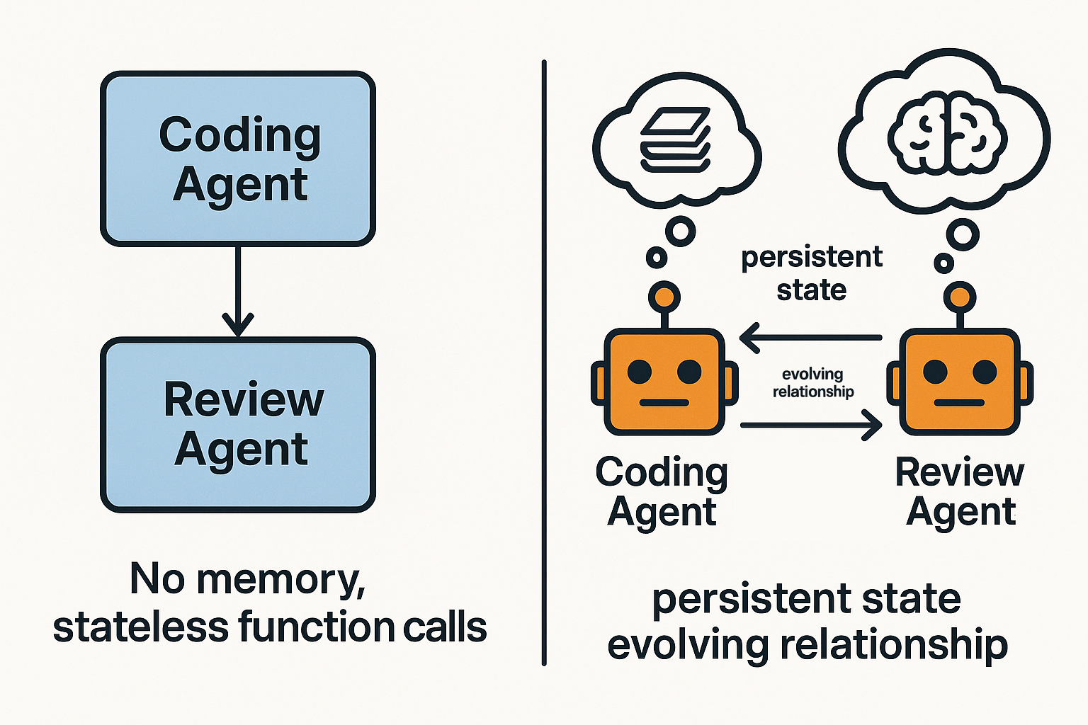 Left: Agents are just function calls. Right: A multi agent system with persistent state that affects future interactions.