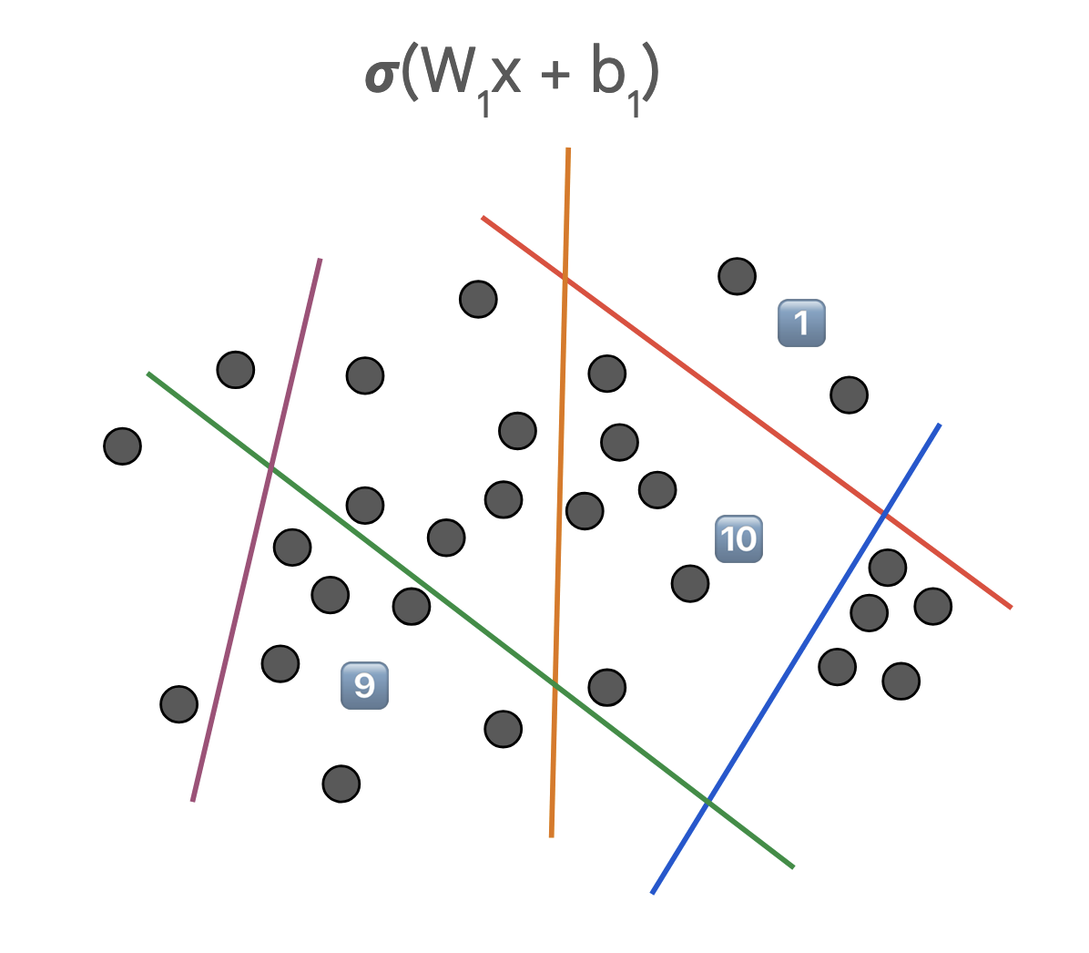 Figure 2: Illustration of a single hidden layer neural network. Each neuron creates a hyperplane, the combination of which leads to hashing out the input space to have fine-grained mapping into different outputs.